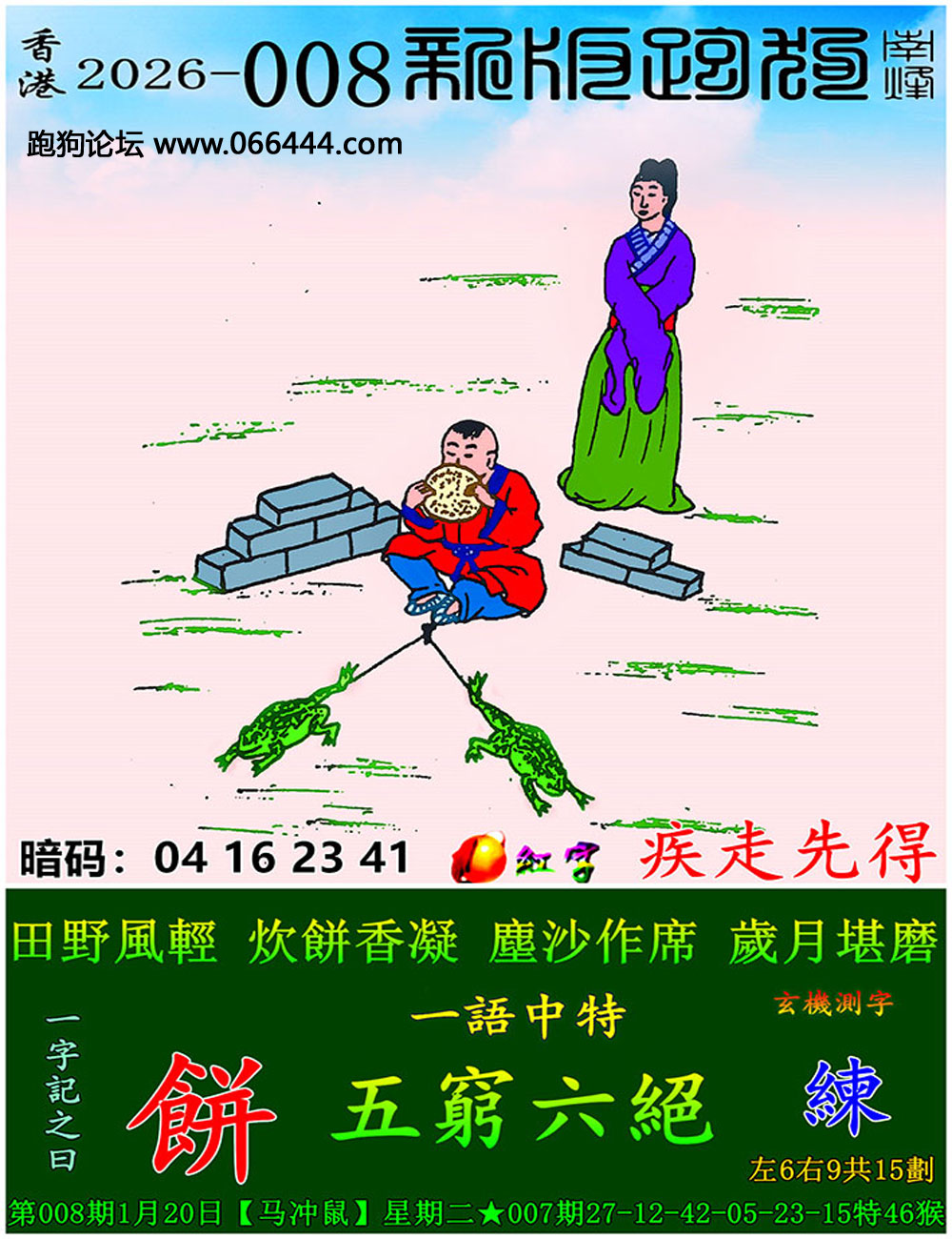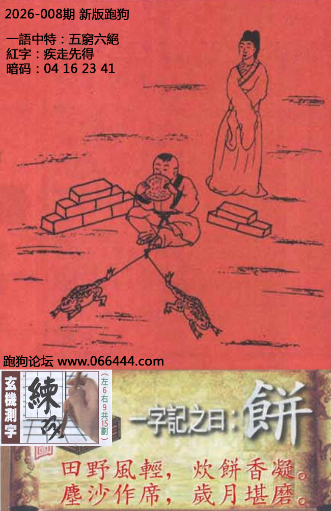 008期六合皇信箱红字【疾走先得】《暗码:04 16 23 41》开